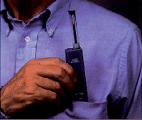 tubing and charcoal tube holder clipped to lapel. - Light (4 oz.) and compact, with flame retardant case.